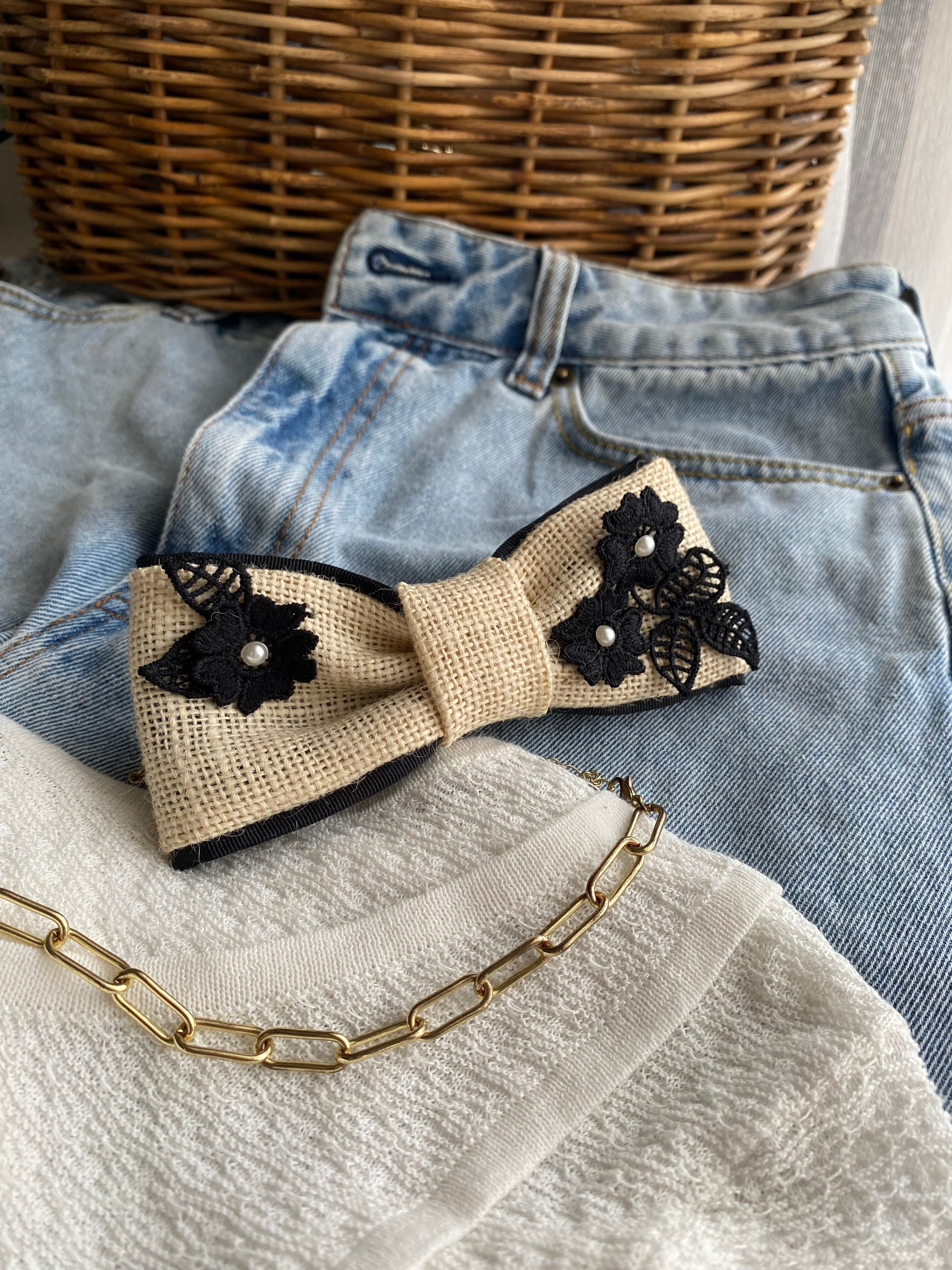 天然素材 夏の涼しげ麻クリップ ブラックフラワー