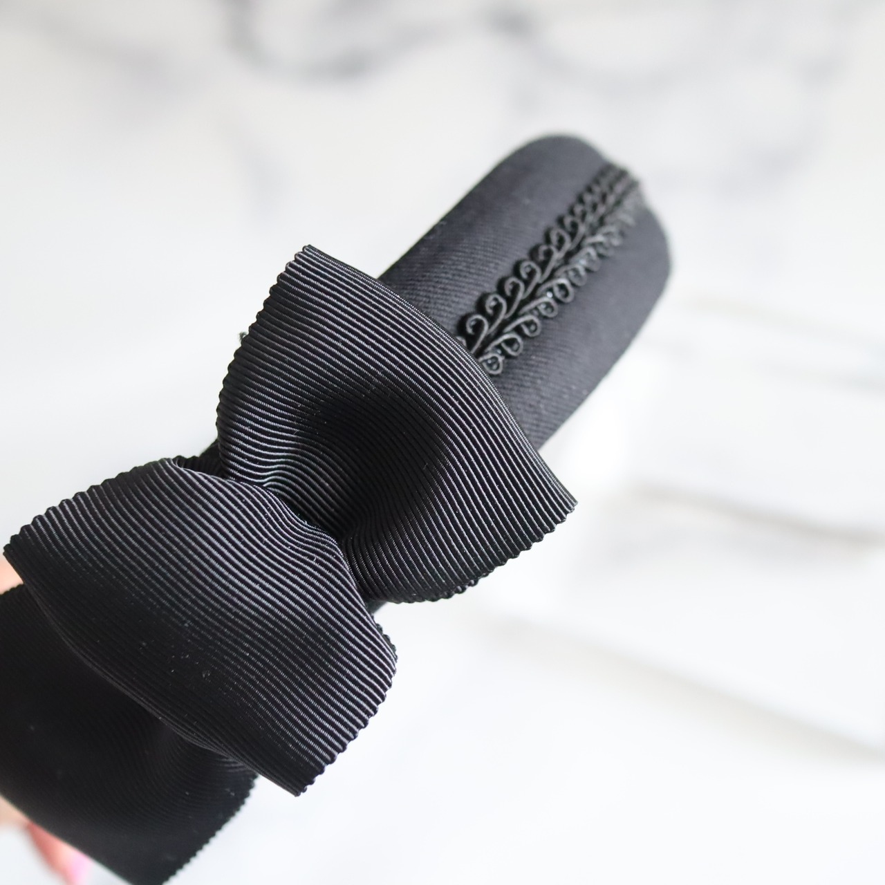アシンメトリーなおリボンがサイドに付いていて